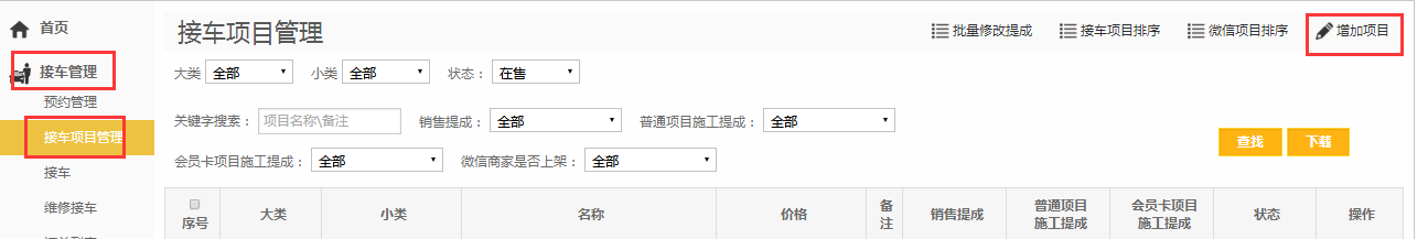 第一步:点击【接车管理】模块,选择【接车项目管理】;