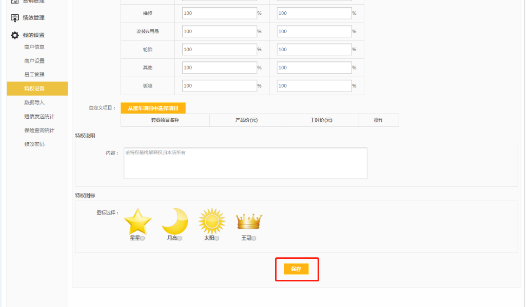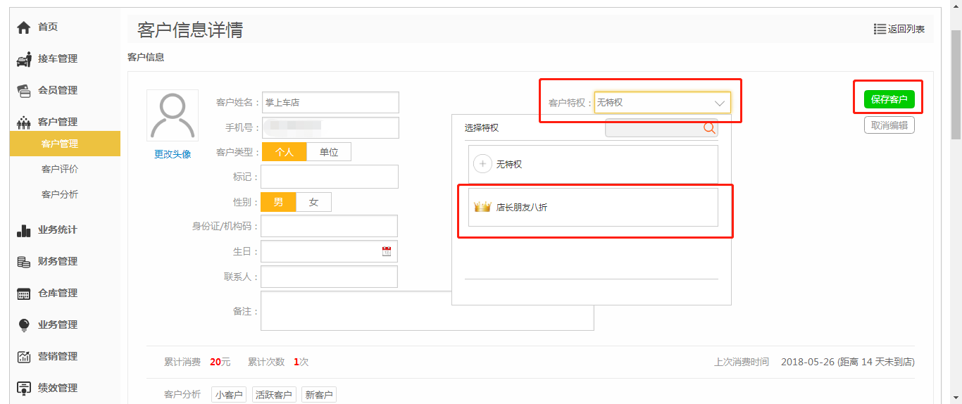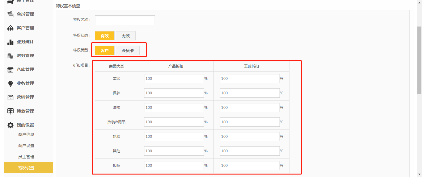 客户特权:挂在车主名下的折扣,指的是当这位客户来消费时,即可享受折扣;