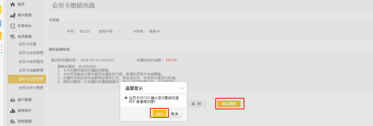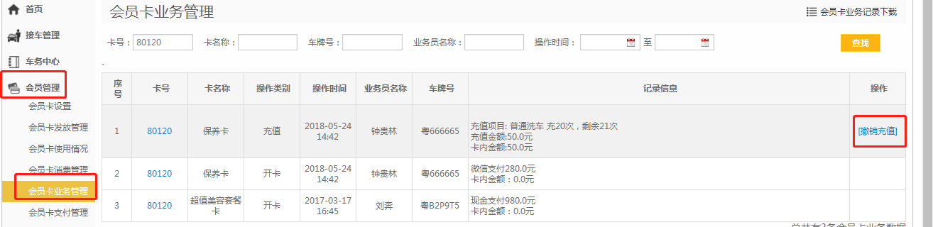 第二步:查找相应的会员卡,点击【撤销充值】;
