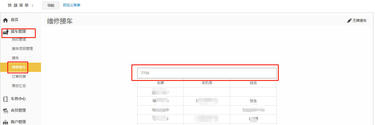 第一步:点击【接车管理】-【维修接车】;
