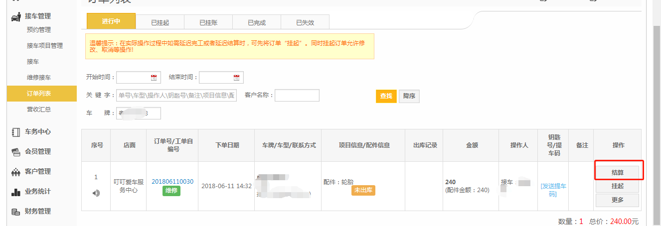 第五步:进入【接车管理】-【订单列表】,点击【结算】;