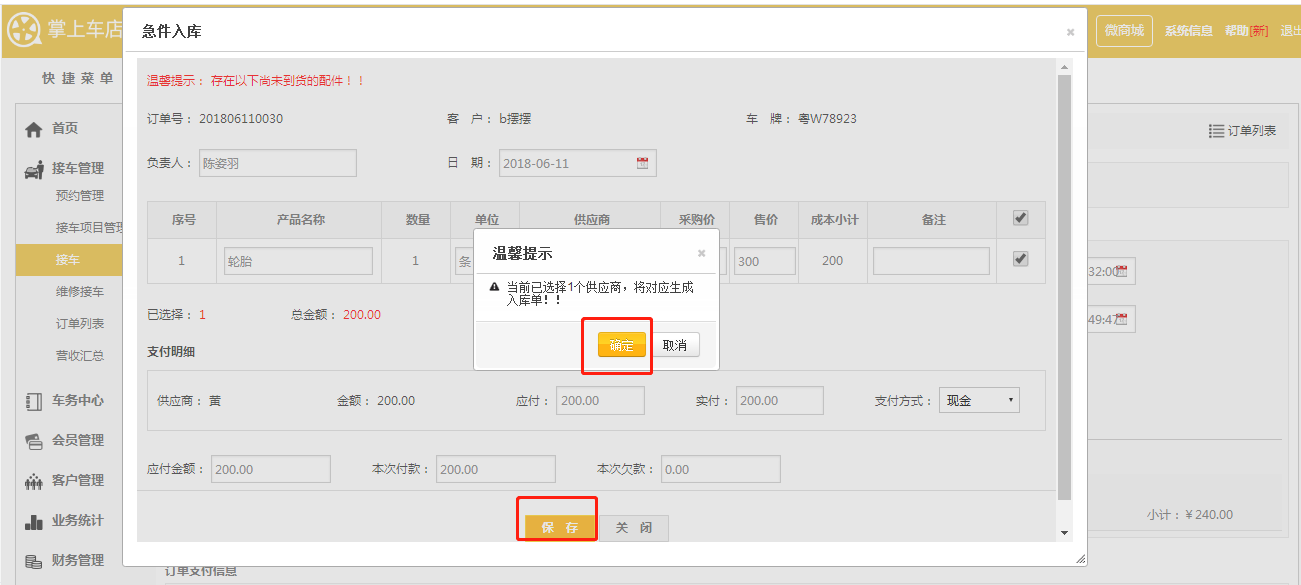 第六步:提交急件入库单,点击【保存】-【确定】;