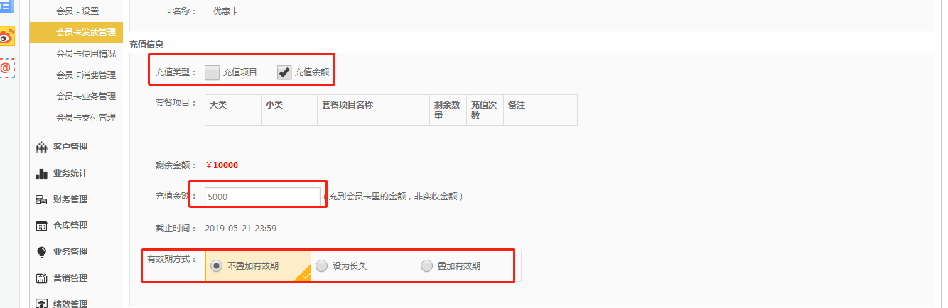 第三步:核对会员卡基础信息,选择会员卡充值类型(充值项目/充值余额),输入充值金额/次数