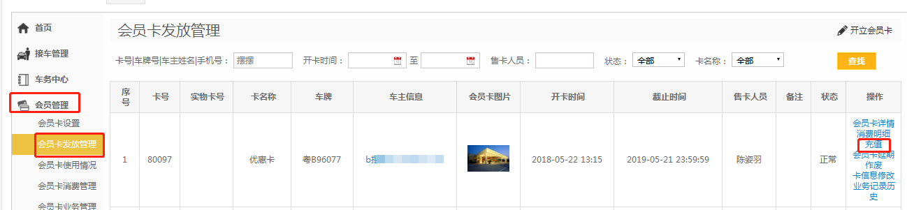 第二步:查找相应的会员卡,点击【充值】;