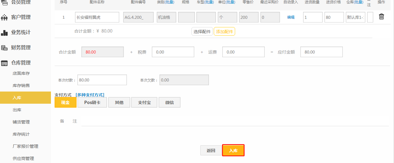 第五步:在新生成的订单上修改好相关内容,点击【入库】;(或者点击【直接作废】,重新入库);
