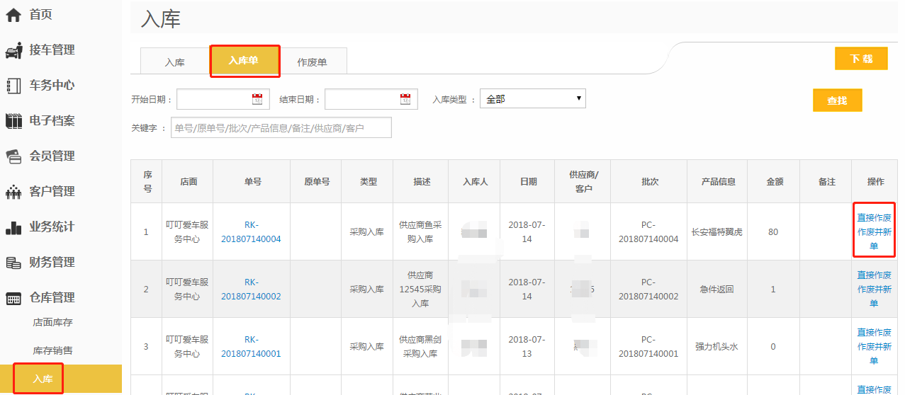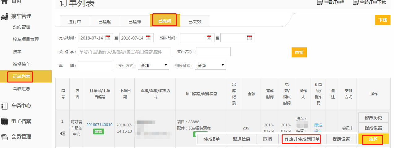 第二步:【接车管理】-【订单列表】把订单【作废并新单】;