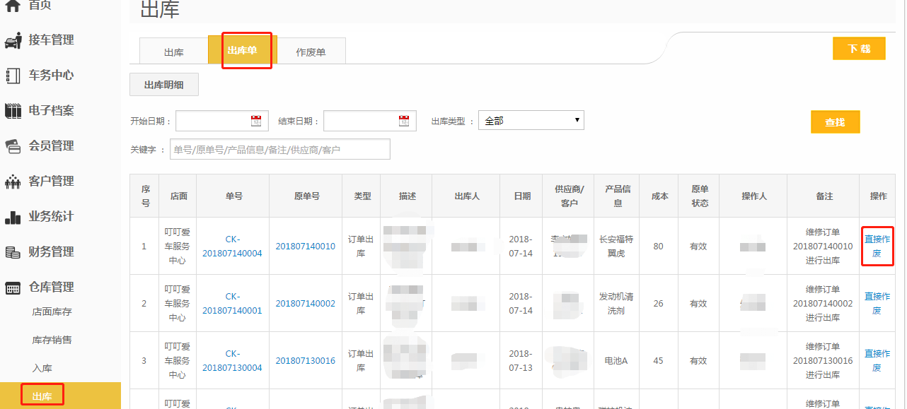 第一步:到【仓库管理】-【出库】-【出库单】找到对应的出库单,点击【直接作废】;