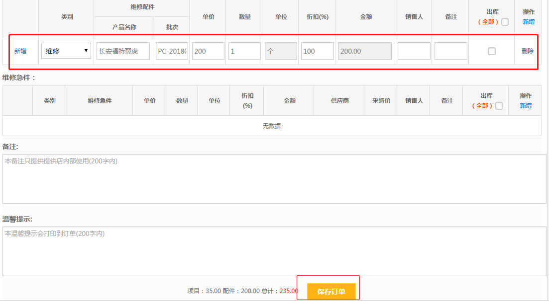 第七步:将急件项目重新添加上去,然后点击【保存订单】。