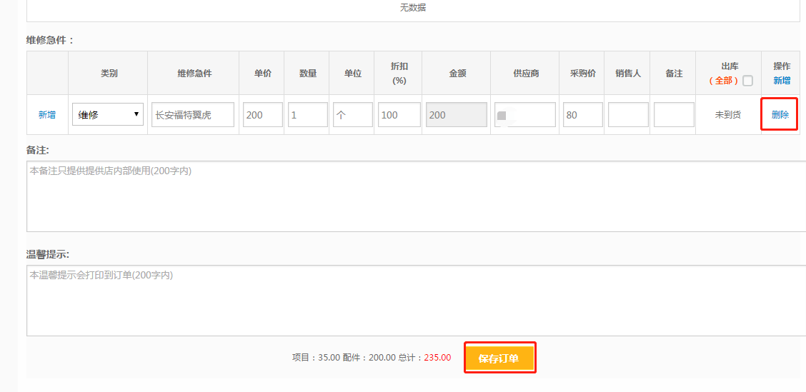 第三步:然后将急件项目删除,点击【保存订单】;