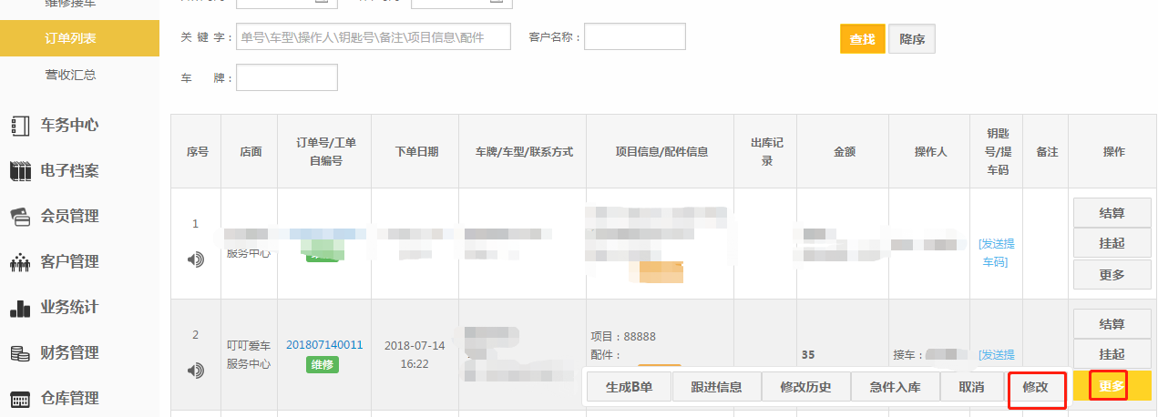 第六步:最后回到【接车管理】-【订单列表】-【更多】-【修改】;