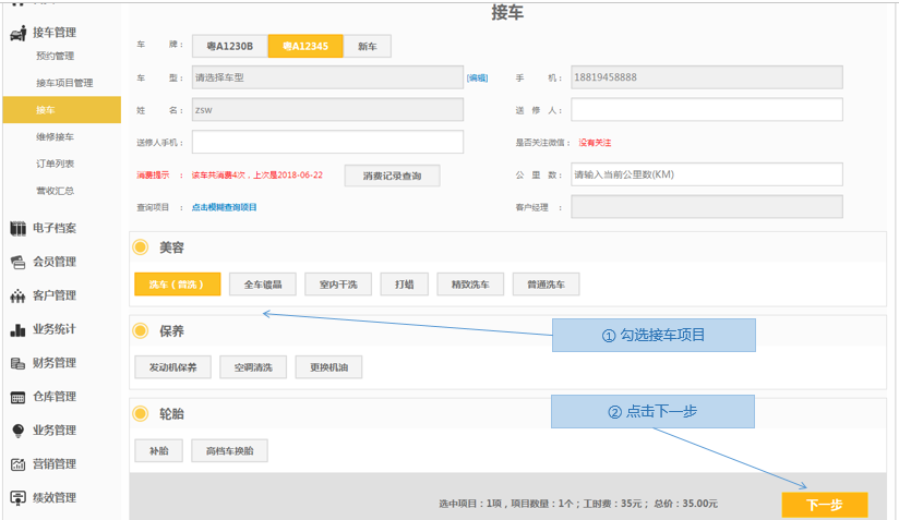 步骤2.选择车辆>勾选接车项目>下一步