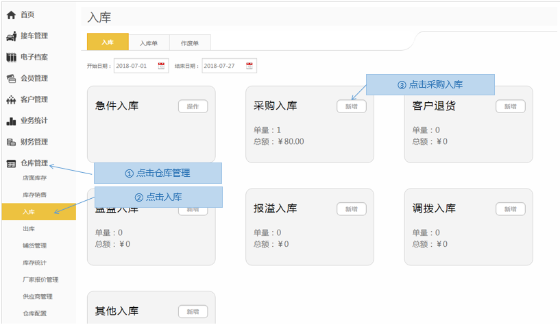 步骤1.进入掌上车店>仓库管理>入库>采购入库