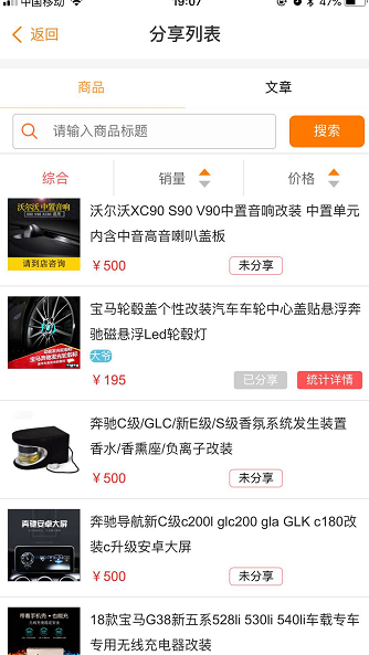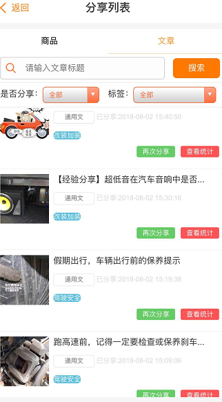 掌上车店销售雷达里的“分享列表管理”功能主要为展示并显示商家的商品、文章内容的功能,门店管理人员可根据商品或文章进行在此页面分享,同时为门店提供文章发布功能,方便门店进行相关软文的发布及分享。【如下图1、2、3所示】