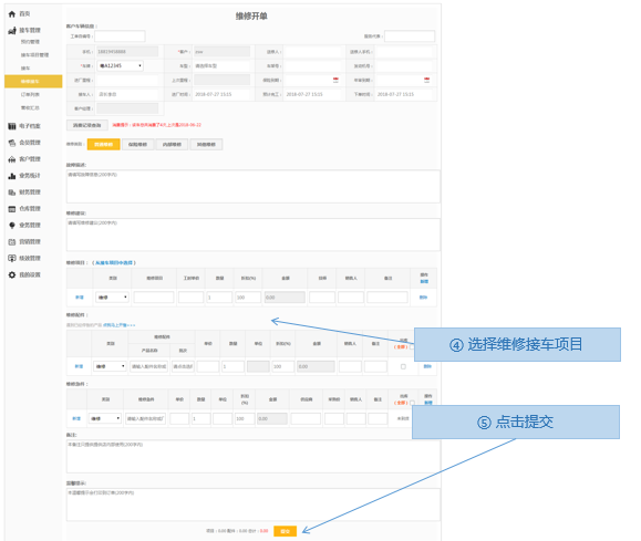 步骤2.选择车辆>选择维修接车项目>提交
