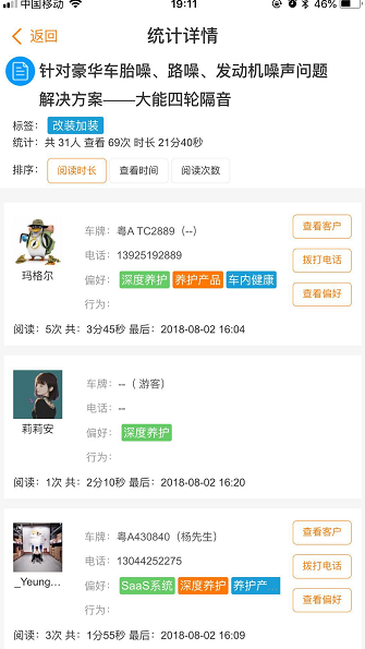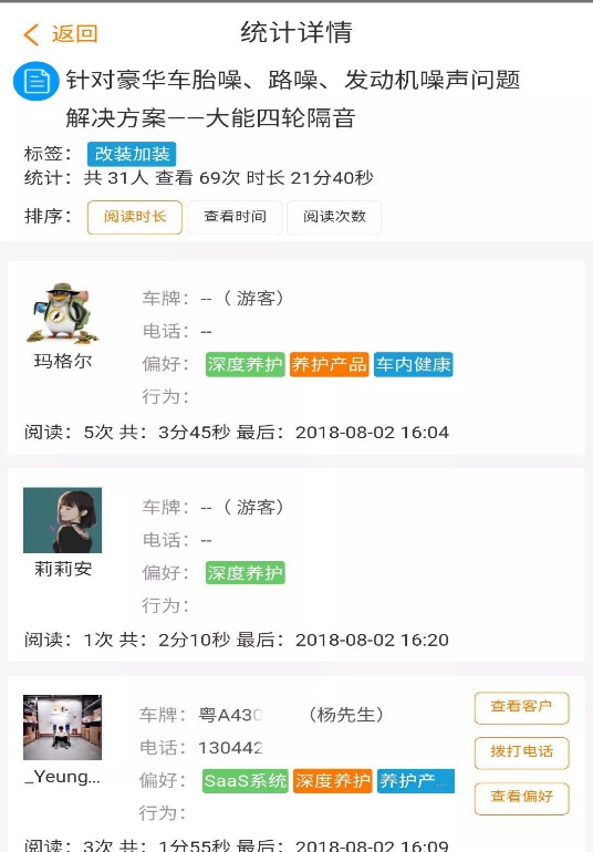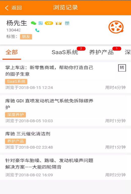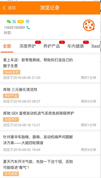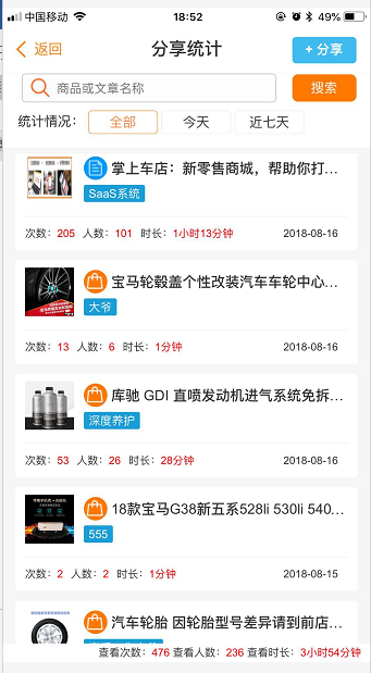 掌上车店微商城的销售雷达功能主要为商家进行汇总商品、文章的访问及用户详情的功能,门店管理人员可根据分享后的商品或文章追溯到用户的访问时间、次数、时长、操作行为等。针对分享的商品,实现用户访问的点击时间,在销售雷达监控页面进行实时查看。【如下图1、2、3、4所示】