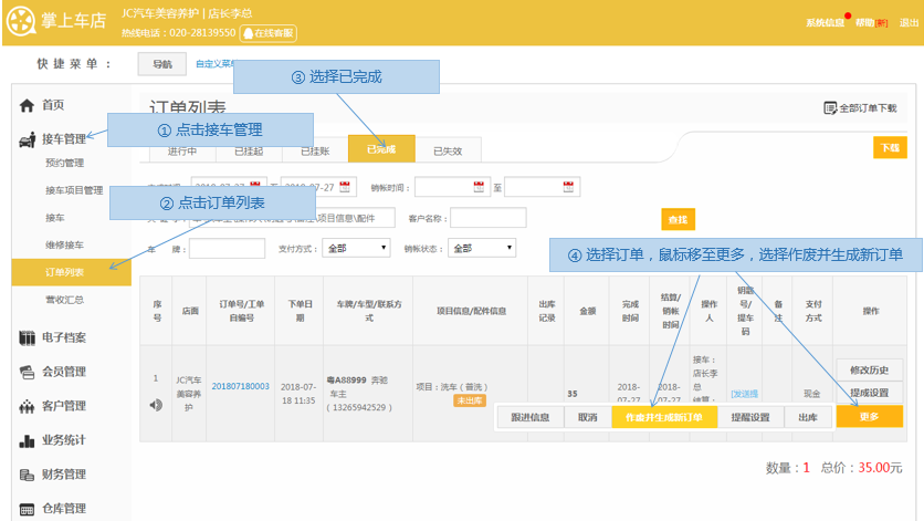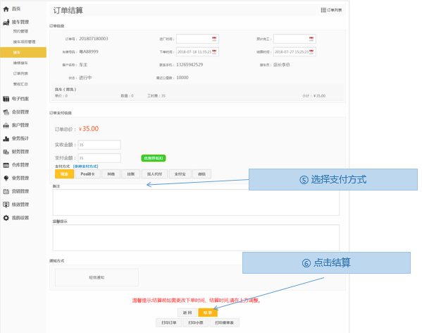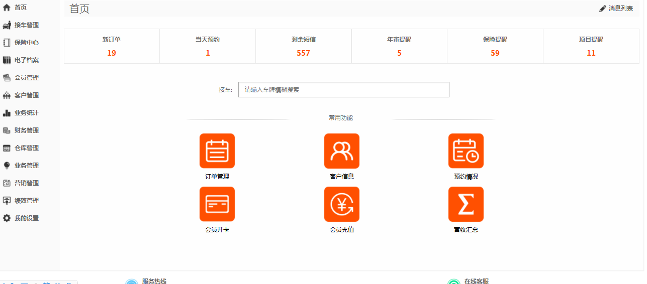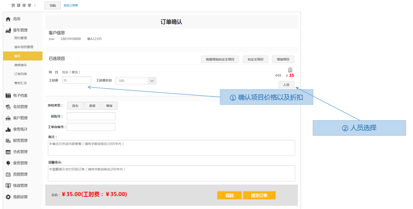 提供店面日常基础接车的基础操作流程,实现快速确认项目、派工、提交接车单,快捷对订单进行分类,收银结算,快速完成店面日常店务工作