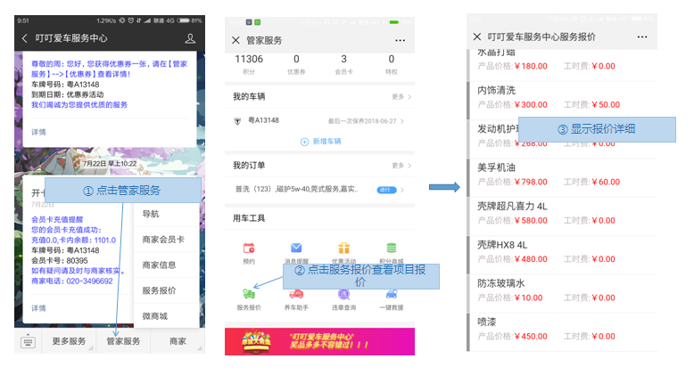 登录门店商家公众号后,点击“管家服务”菜单进入,可对我的车辆进行添加及配置功能。【如下图1、2、3所示】