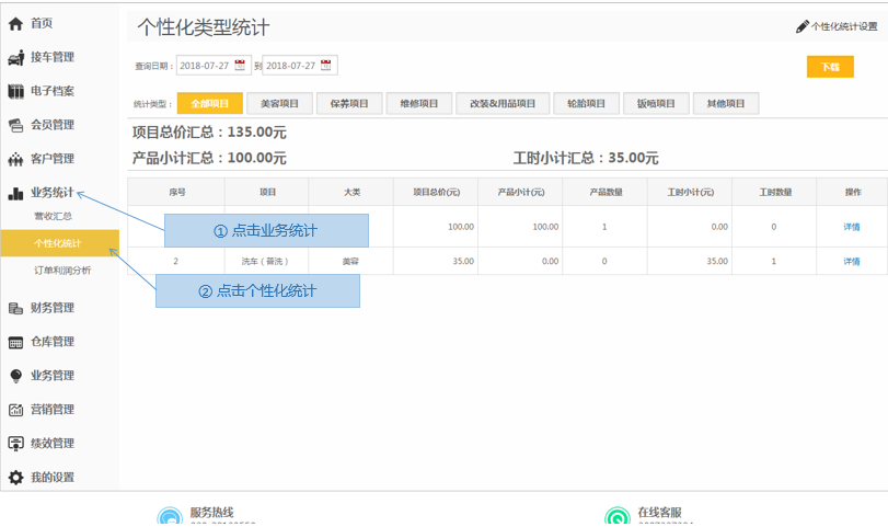 步骤1.掌上车店>业务统计>个性化统计
