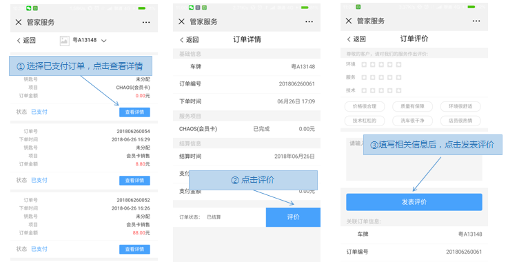 登录门店商家公众号后,点击“管家服务”菜单进入,可对我的订单进行查看及了解订单情况。【如下图1、2、3所示】