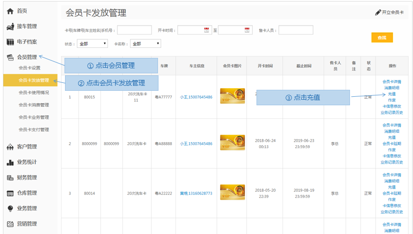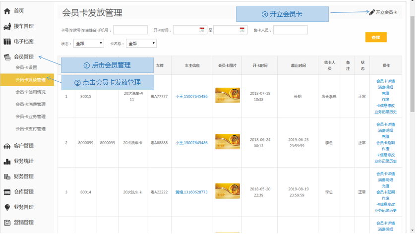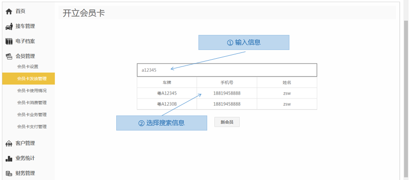 步骤1.进入掌上车店>会员管理>会员卡发放管理>开立会员卡