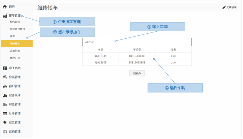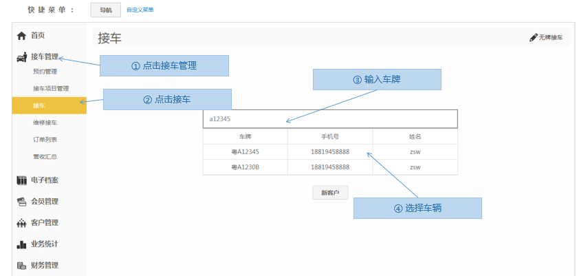 步骤1.进入掌上车店>接车管理>维修接车>输入车牌