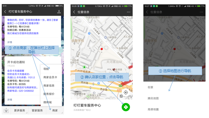 掌上车店的商家“导航”功能,主要为商家提供自己门店地址的导航功能;关注本门店的车主可根据导航功能直接到门店进行服务。车主点击商家的“导航”菜单功能进入导航页面【如下图1、2所示】