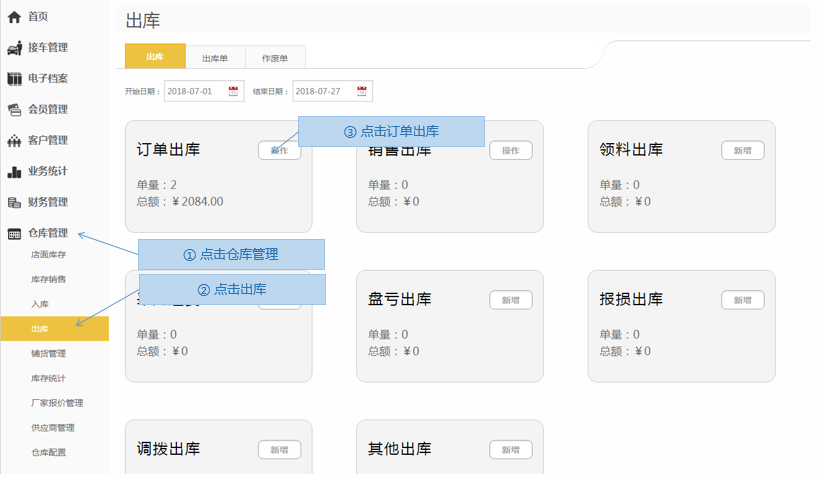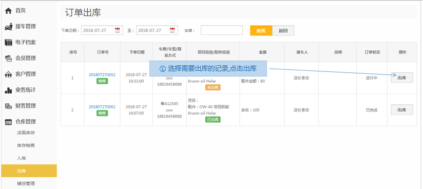 步骤1.进入掌上车店>仓库管理>出库>订单出库