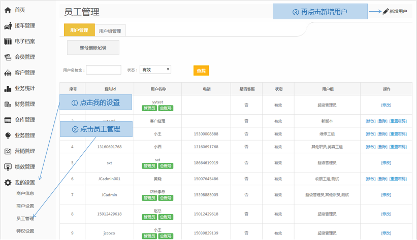 步骤1.进入掌上车店>我的设置>员工管理>用户管理>新增用户
