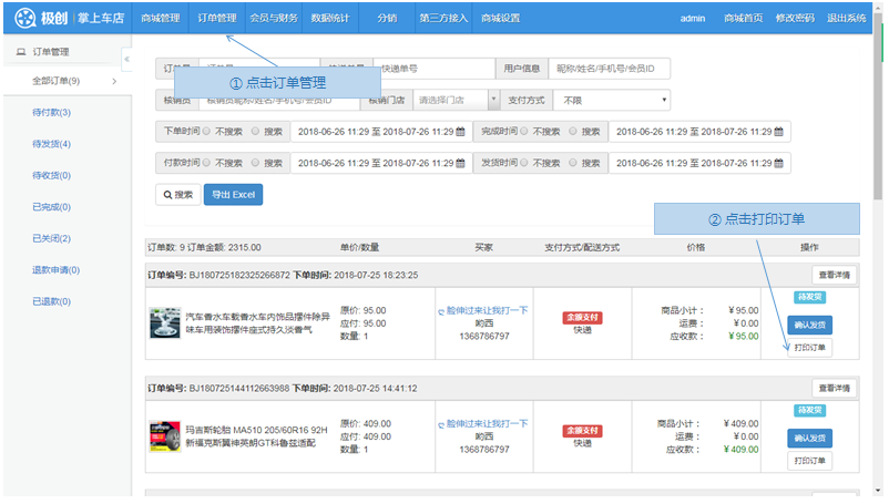 步骤1.微商城>订单管理>打印订单