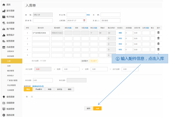 步骤2.输入配件信息>入库