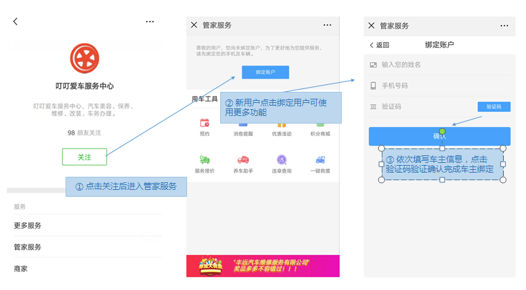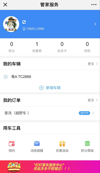 管家服务的主要功能包括车辆信息、订单信息、会员信息、优惠卷、用车工具等功能,使用管家服务功能之前必须进行用户信息的关联及注册,方便商家进行对数据采集和业务处理。【如下图1、2、3所示】