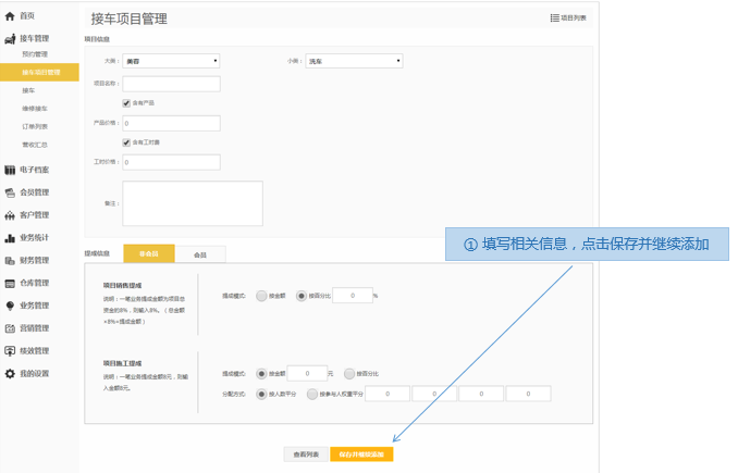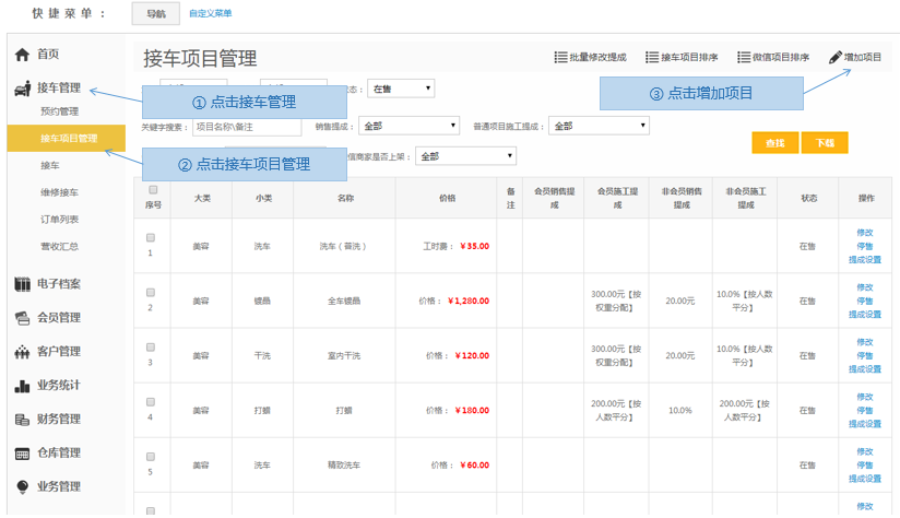 步骤1.进入掌上车店>接车管理>接车项目管理>增加项目