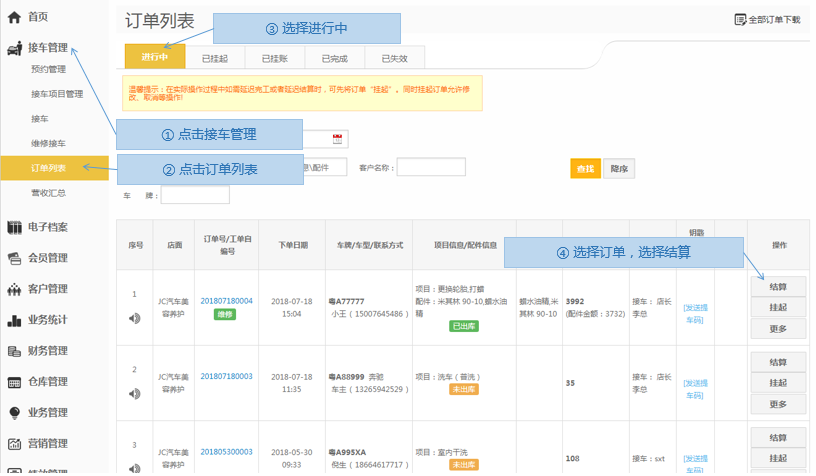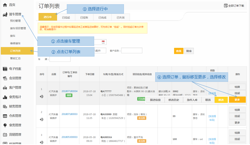 步骤1.进入掌上车店>接车管理>订单列表>进行中