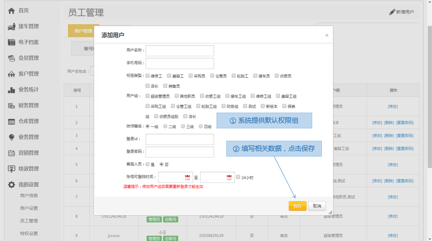 门店企业开通掌上车店服务后,需要对本系统进行数据初始化才能正常使用,门店企业管理人员可登录系统后,对运营配置进行设定、员工账号的设定,系统提供默认的权限组别,点选就可以使用,将常规店面上的项目与售卡套餐一次性设置在系统配置中,就可以在后续是使用系统过程中更加简单快捷。