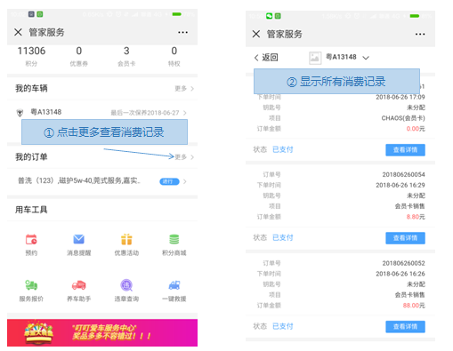 掌上车店公众号的管家服务里面的“我的订单”功能主要提供给已关注的车主进行车辆日常消费订单关联功能,方便车主在本店服务后的数据登记和日常消费查询。