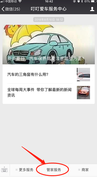 步骤1.在公众号中选择菜单>管家服务