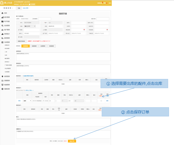 步骤3.选择出库的配件>保存订单