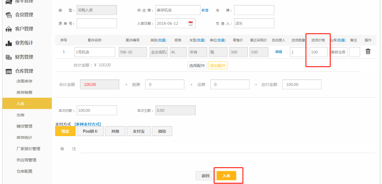 第五步:在生成的订单上面修改好成本-【入库】即可;