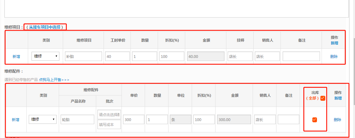 2.维修接车可在下单时选择出库,勾选了出库之后保存时该配件自动出库;