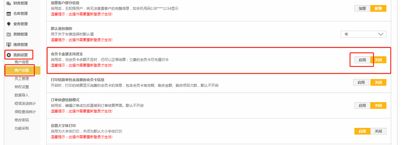 第二步:找到【会员卡金额支持透支】-【启用】。