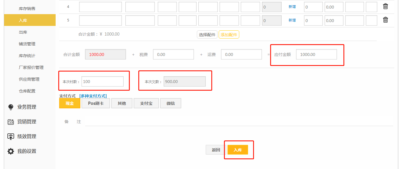注意事项:入库时本次付款低于应付金额会默认生成采购欠款挂账单。