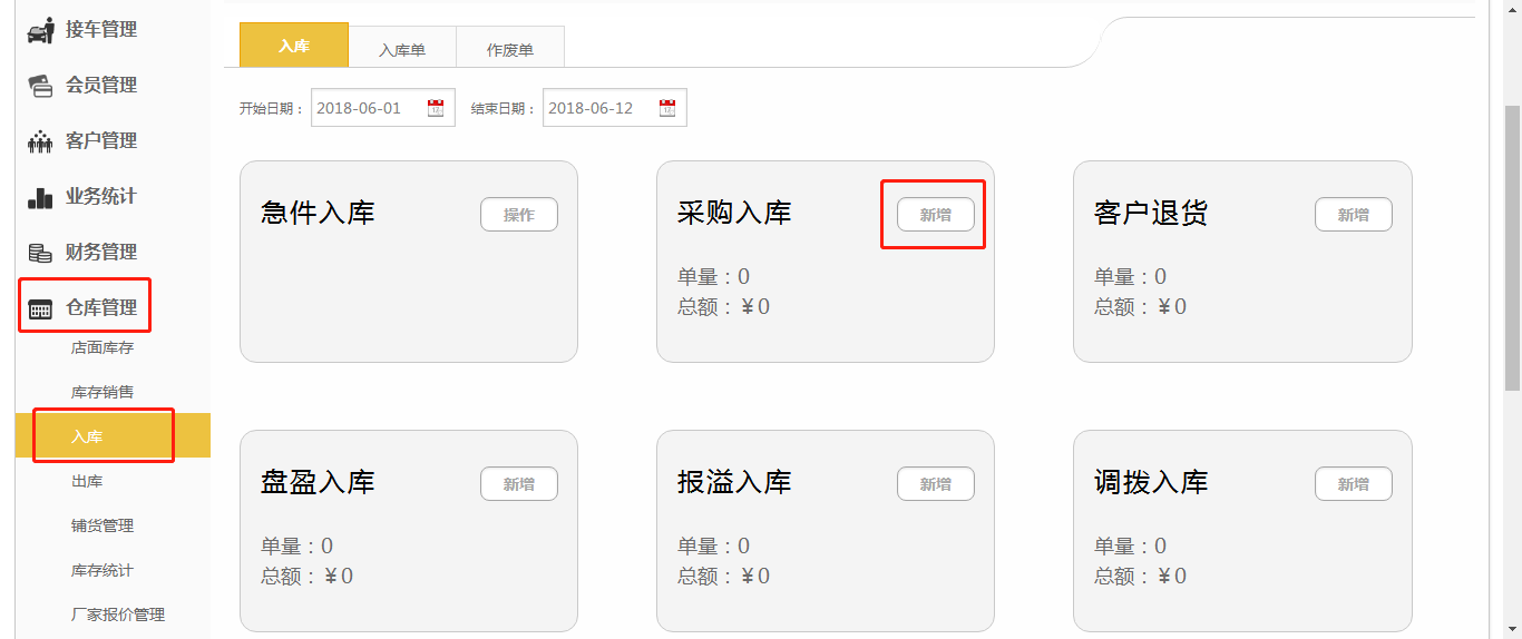 第二步:点击采购入库【新增】;