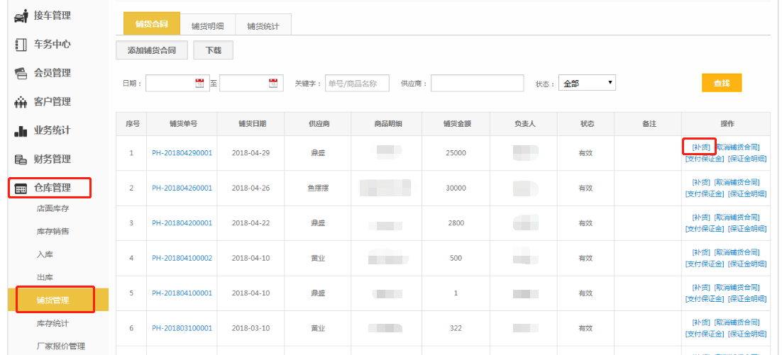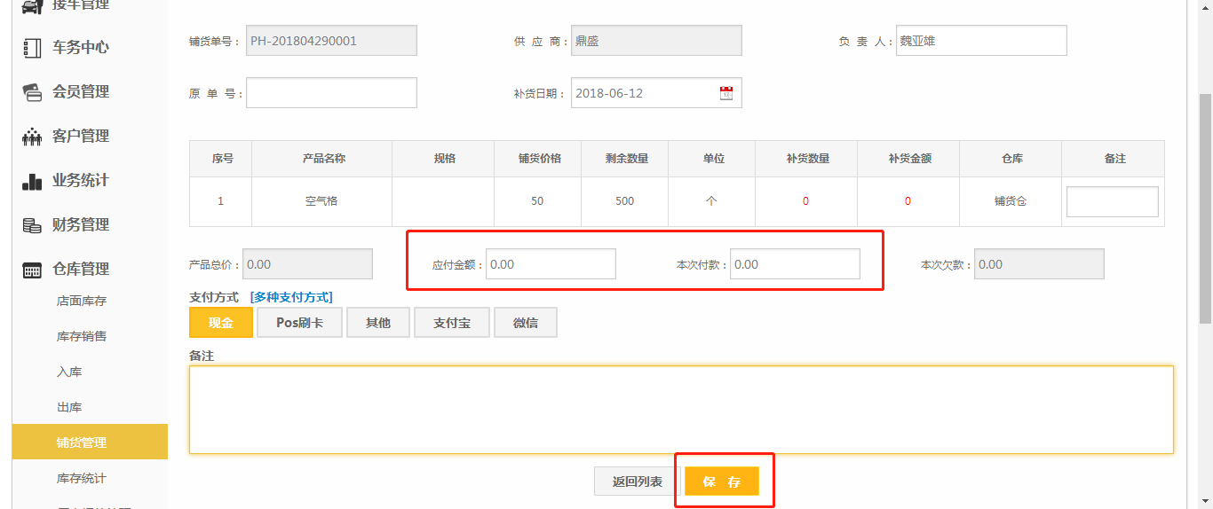 注意事项:铺货合同是用多少只可以补多少,本次付款低于应付金额默认生成补货欠款单。