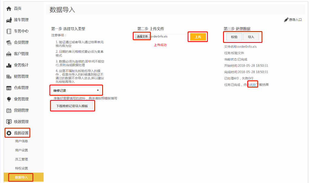 第二步:选择导入类型【维修记录】-【下载维修记录导入模板】;
