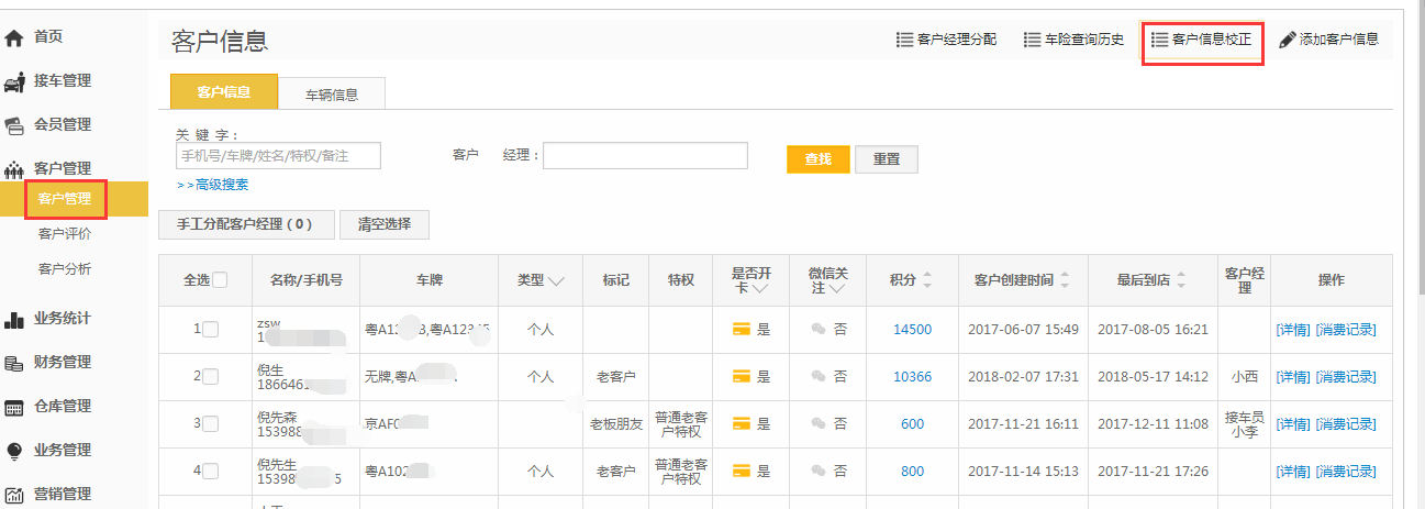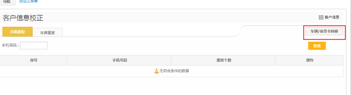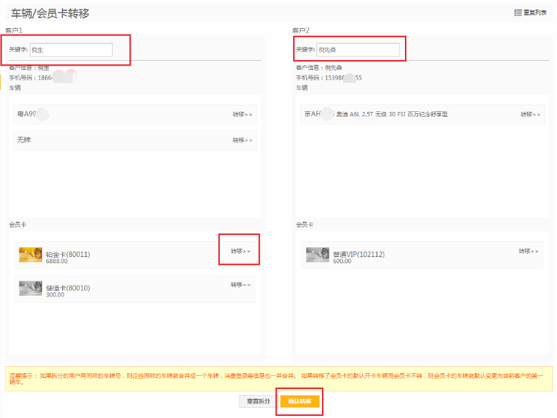 1、在车辆/会员卡转移的界面客户1和客户2可以相互转移会员卡以及车辆;