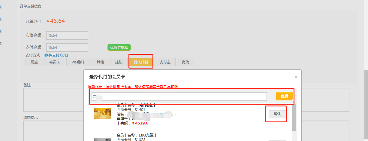 第四步:查找代付的会员卡,点击【确认】;