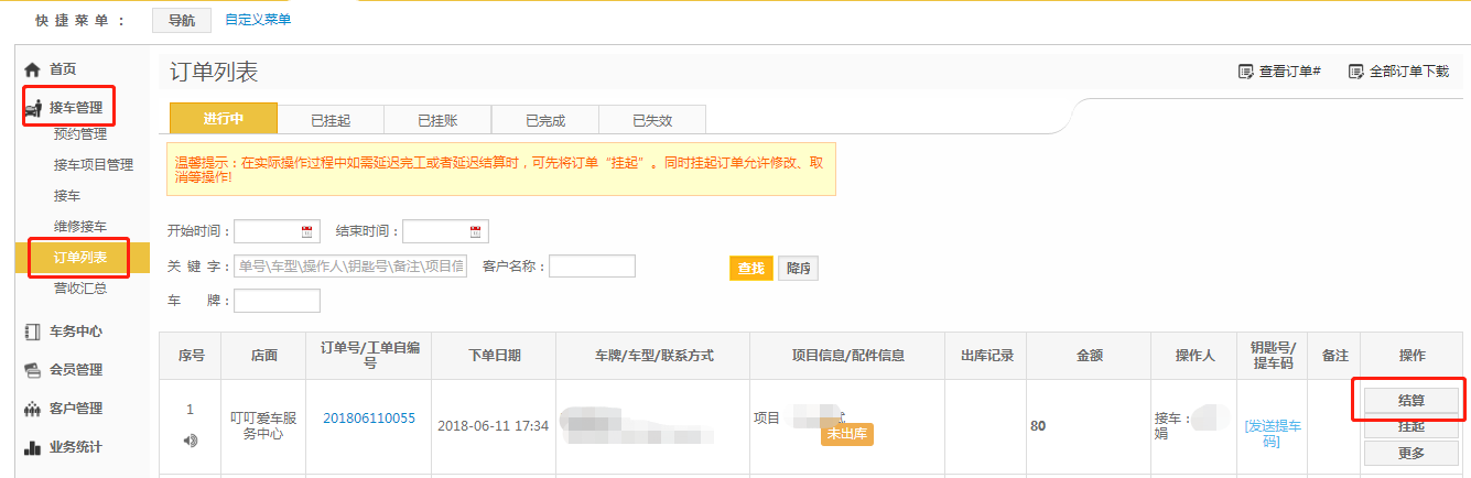 第一步:正常接单之后,进入【接车管理】-【订单列表】;