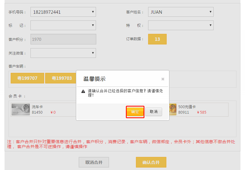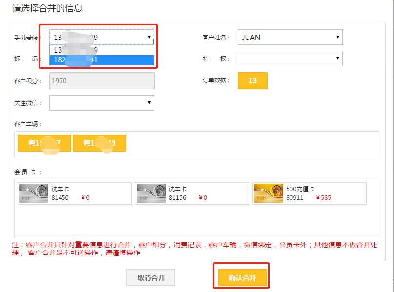 2、被合并客户将消失,信息会被合并到保留的客户,合并后无法恢复,请谨慎操作;