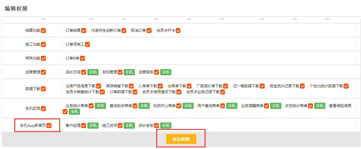 第三步:在编辑权限的界面最下方,勾选手机app新首页,然后【保存权限】即可;