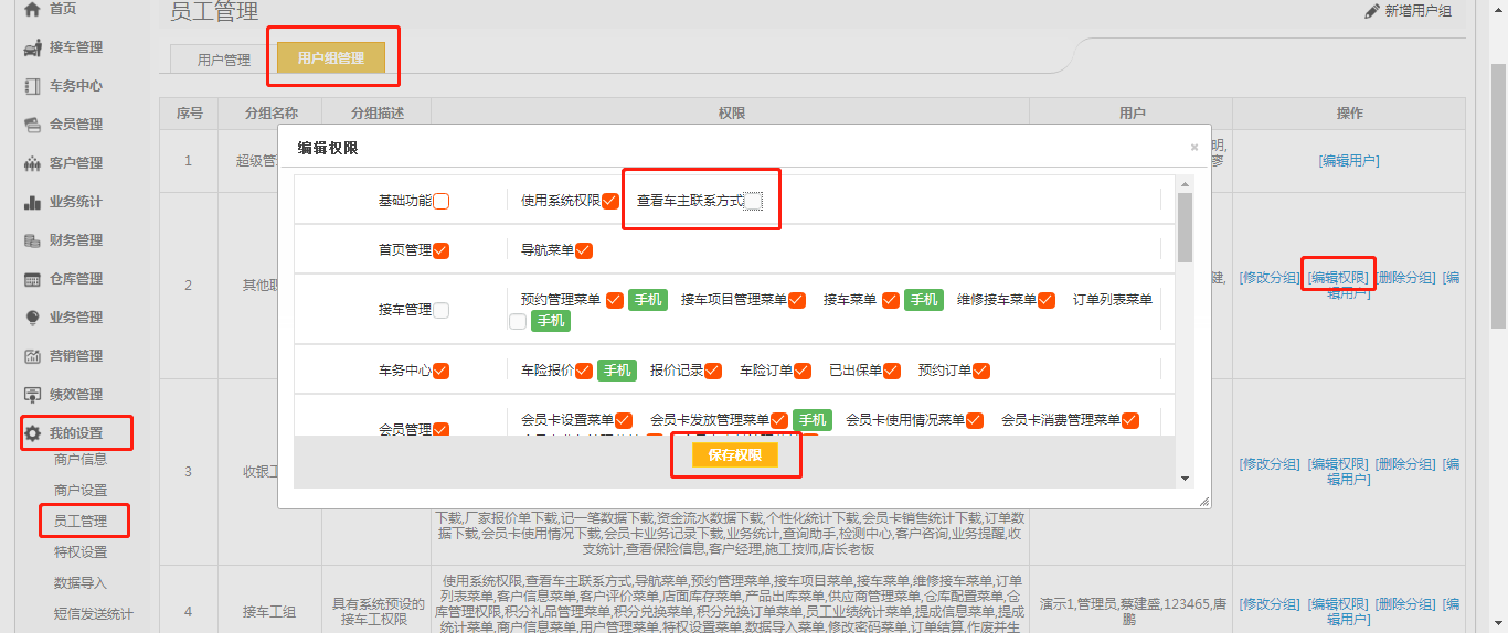 第三步:设置权限【我的设置】-【员工管理】;